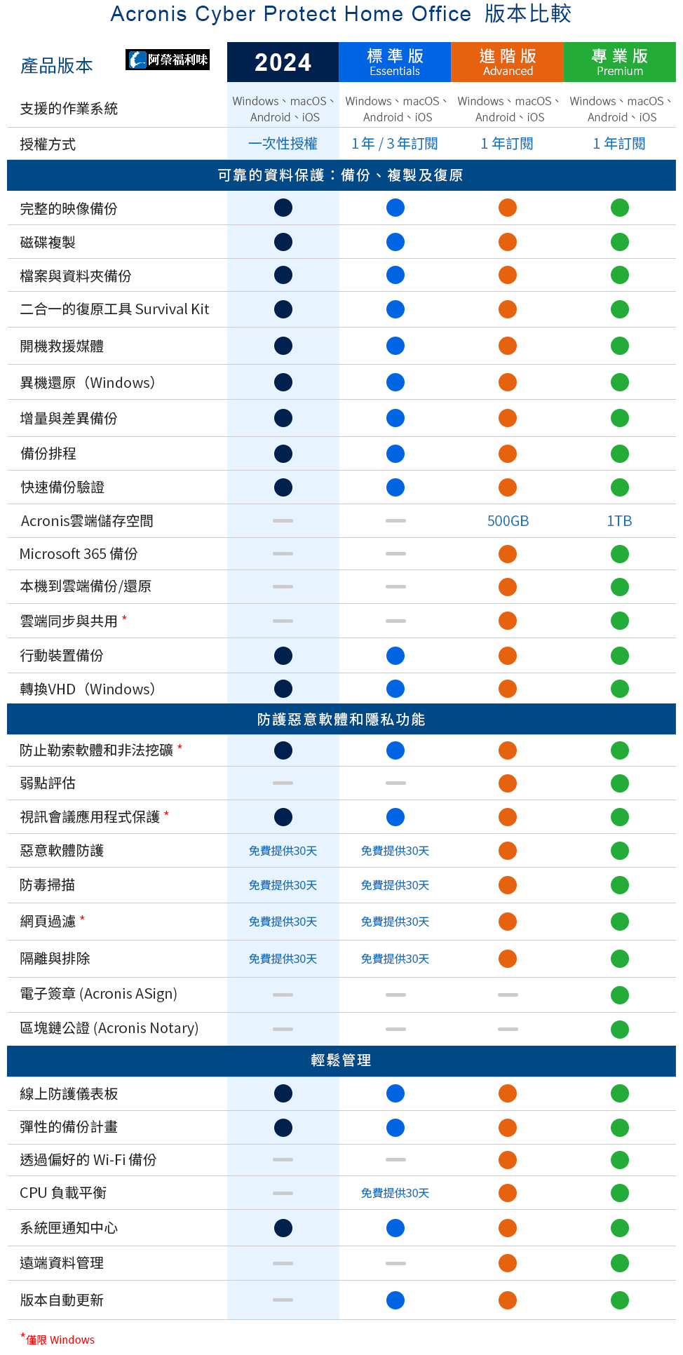 5. 版本比較:https://azotaiwan.com/azo/Acronis_Cyber_Protect_Home_Office_compare.png